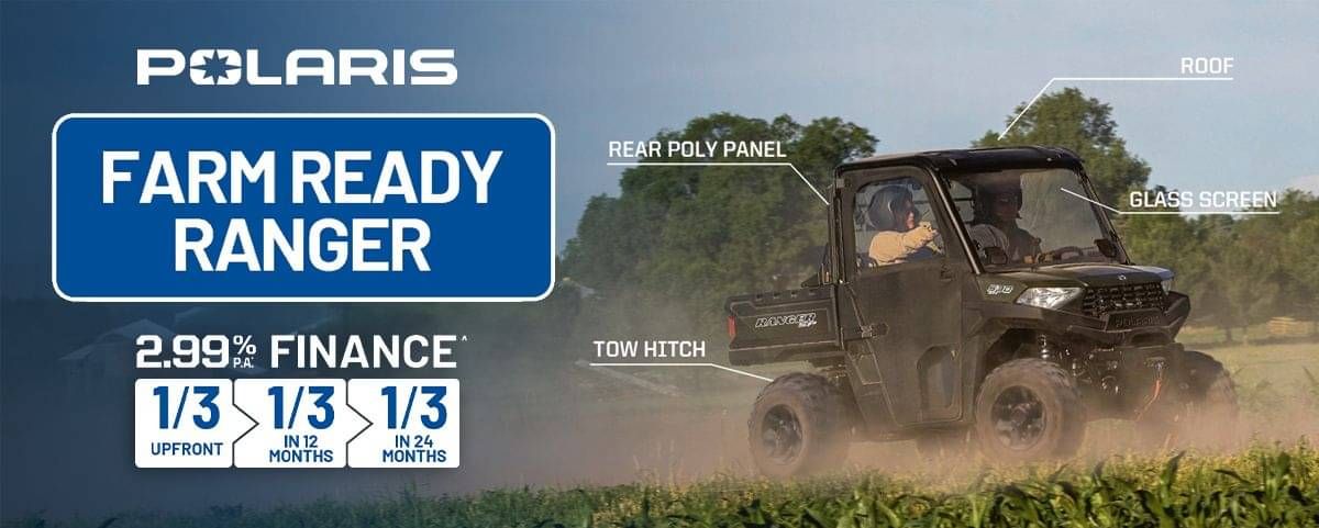 Receive a Roof, Glass Screen, Rear Poly Panel and Tow Hitch when purchasing an eligible model.* With stock readily available, you could pick up a new Polaris Off-Road vehicle for a 2.99% p.a. finance rate over 24 months. 1/3 upfront, 1/3 in 12 months. 1/3 in 24 months.+